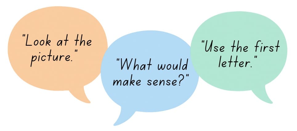 - Graphophonic cues (letters and sounds): "Use the first letter to help you."