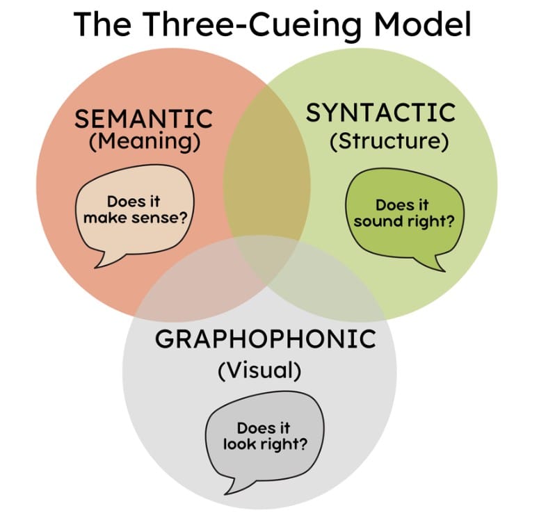 Three-cueing is a theory about how proficient reading works. It's commonly depicted as a Venn diagram with three overlapping circles. According to this theory, proficient readers rely on three types of cues as they read:
