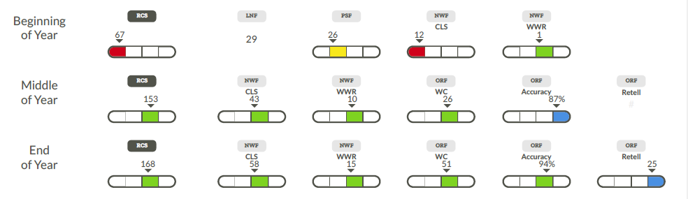 This is an example of how your child’s report may look. This example shows a child who needs some extra support at the beginning of the year and has caught up by the middle of the year.