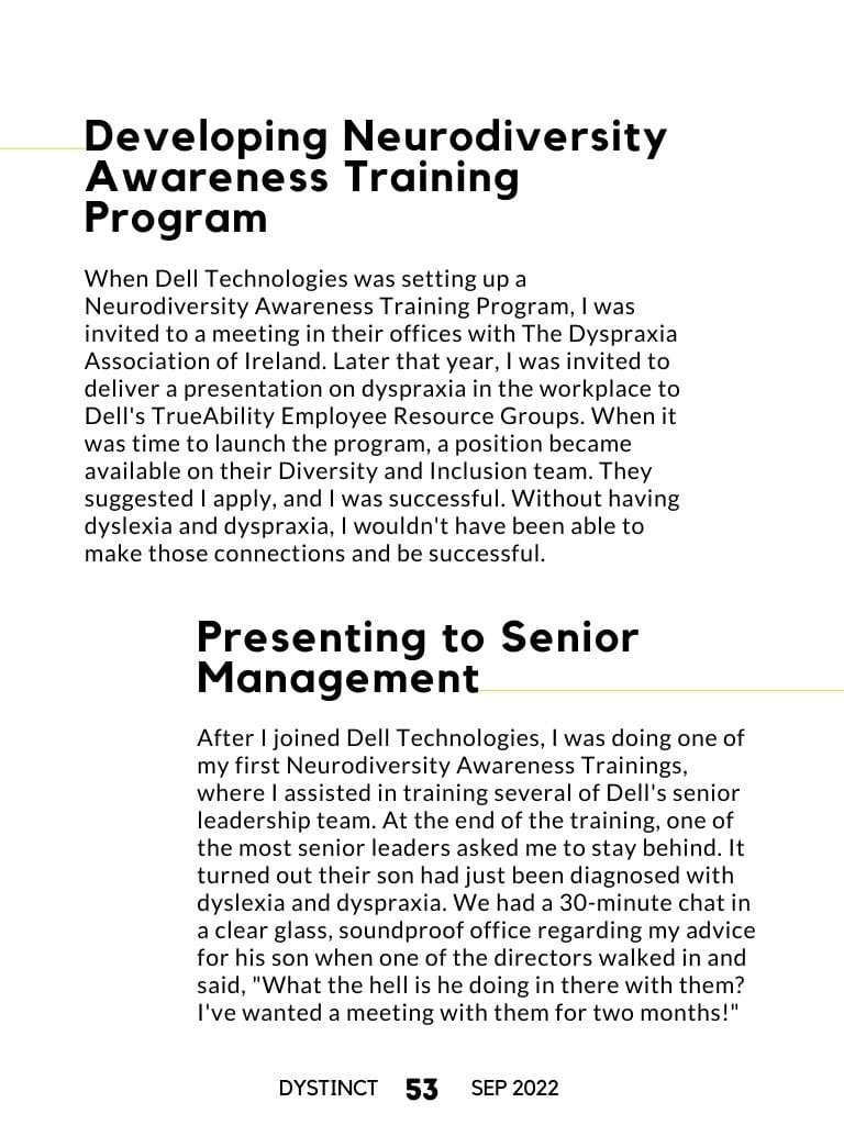 When Dell Technologies was setting up a Neurodiversity Awareness Training Program, I was invited to a meeting in their offices with The Dyspraxia Association of Ireland. Later that year, I was invited to deliver a presentation on dyspraxia in the workplace to Dell's TrueAbility Employee Resource Groups. When it was time to launch the program, a position became available on their Diversity and Inclusion team. They suggested I apply, and I was successful. Without having dyslexia and dyspraxia, I wouldn't have been able to make those connections and be successful.