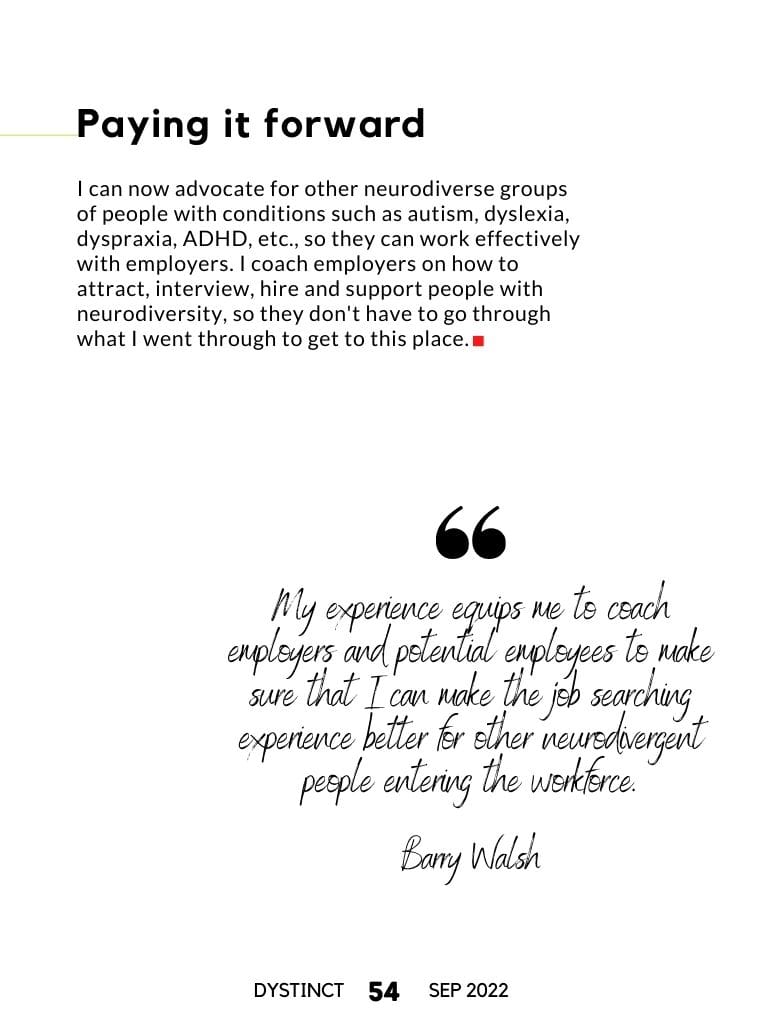 I can now advocate for other neurodiverse groups of people with conditions such as autism, dyslexia, dyspraxia, ADHD, etc., so they can work effectively with employers. I coach employers on how to attract, interview, hire and support people with neurodiversity, so they don't have to go through what I went through to get to this place.