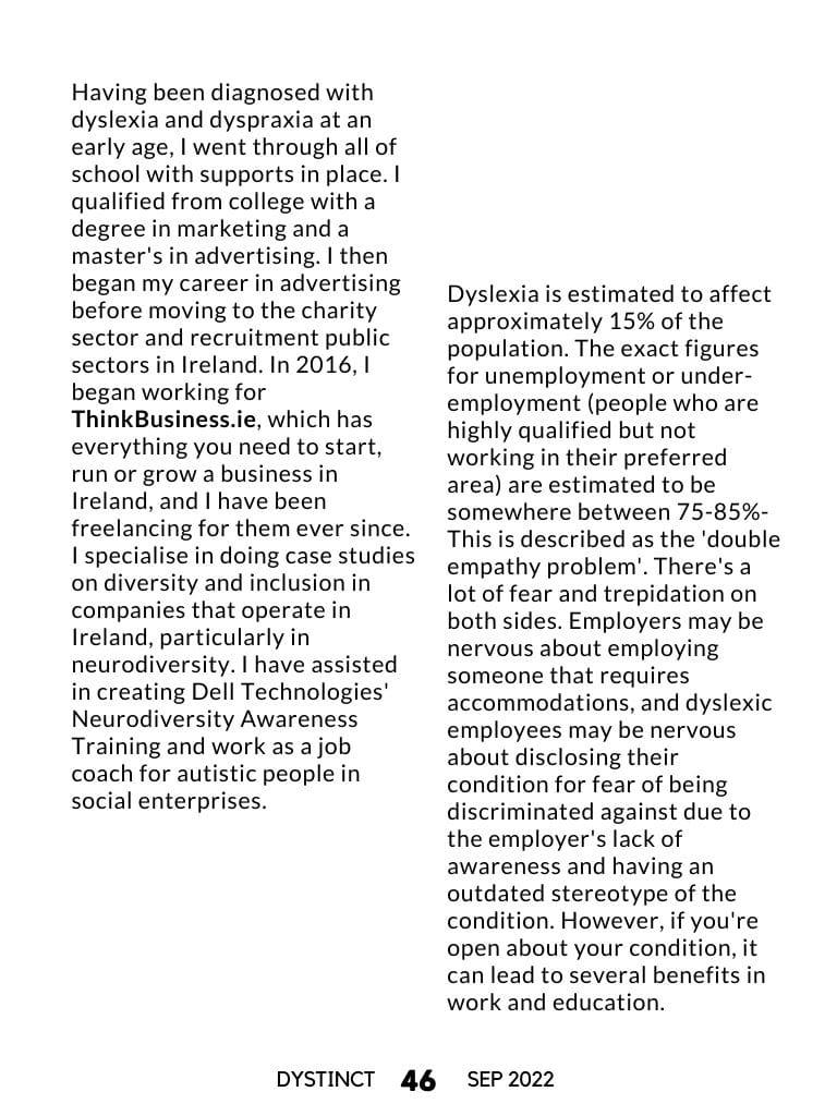 Having been diagnosed with dyslexia and dyspraxia at an early age, I went through all of school with supports in place. I qualified from college with a degree in marketing and a master's in advertising. I then began my career in advertising before moving to the charity sector and recruitment public sectors in Ireland. In 2016, I began working for ThinkBusiness.ie, which has everything you need to start, run or grow a business in Ireland, and I have been freelancing for them ever since. I specialise in doing case studies on diversity and inclusion in companies that operate in Ireland, particularly in neurodiversity. I have assisted in creating Dell Technologies' Neurodiversity Awareness Training and work as a job coach for autistic people in social enterprises.