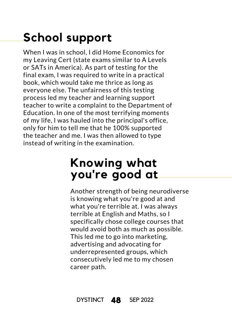 Another strength of being neurodiverse is knowing what you're good at and what you're terrible at. I was always terrible at English and Maths, so I specifically chose college courses that would avoid both as much as possible. This led me to go into marketing, advertising and advocating for underrepresented groups, which consecutively led me to my chosen career path.