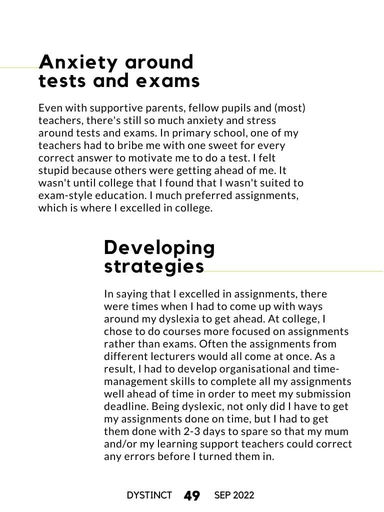 Even with supportive parents, fellow pupils and (most) teachers, there's still so much anxiety and stress around tests and exams. In primary school, one of my teachers had to bribe me with one sweet for every correct answer to motivate me to do a test. I felt stupid because others were getting ahead of me. It wasn't until college that I found that I wasn't suited to exam-style education. I much preferred assignments, which is where I excelled in college.