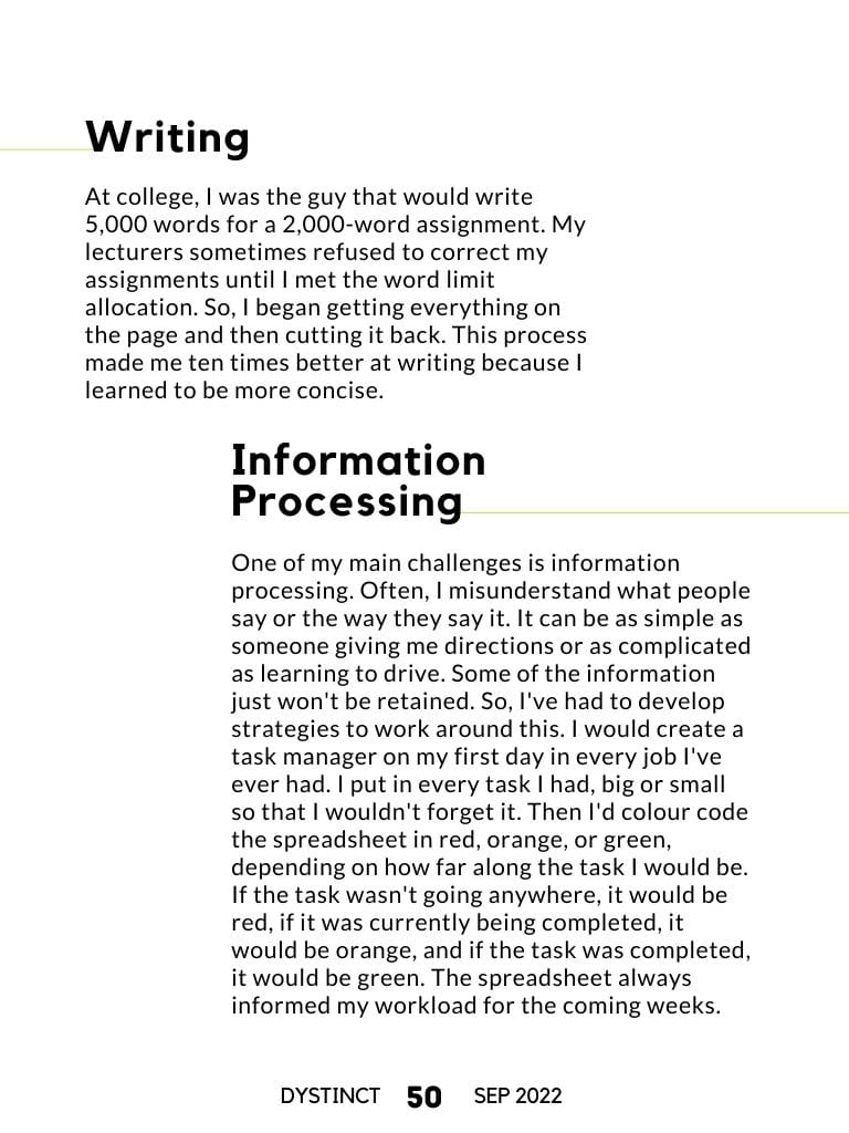 One of my main challenges is information processing. Often, I misunderstand what people say or the way they say it. It can be as simple as someone giving me directions or as complicated as learning to drive. Some of the information just won't be retained. So, I've had to develop strategies to work around this. I would create a task manager on my first day in every job I've ever had. I put in every task I had, big or small so that I wouldn't forget it. Then I'd colour code the spreadsheet in red, orange, or green, depending on how far along the task I would be. If the task wasn't going anywhere, it would be red, if it was currently being completed, it would be orange, and if the task was completed, it would be green. The spreadsheet always informed my workload for the coming weeks.