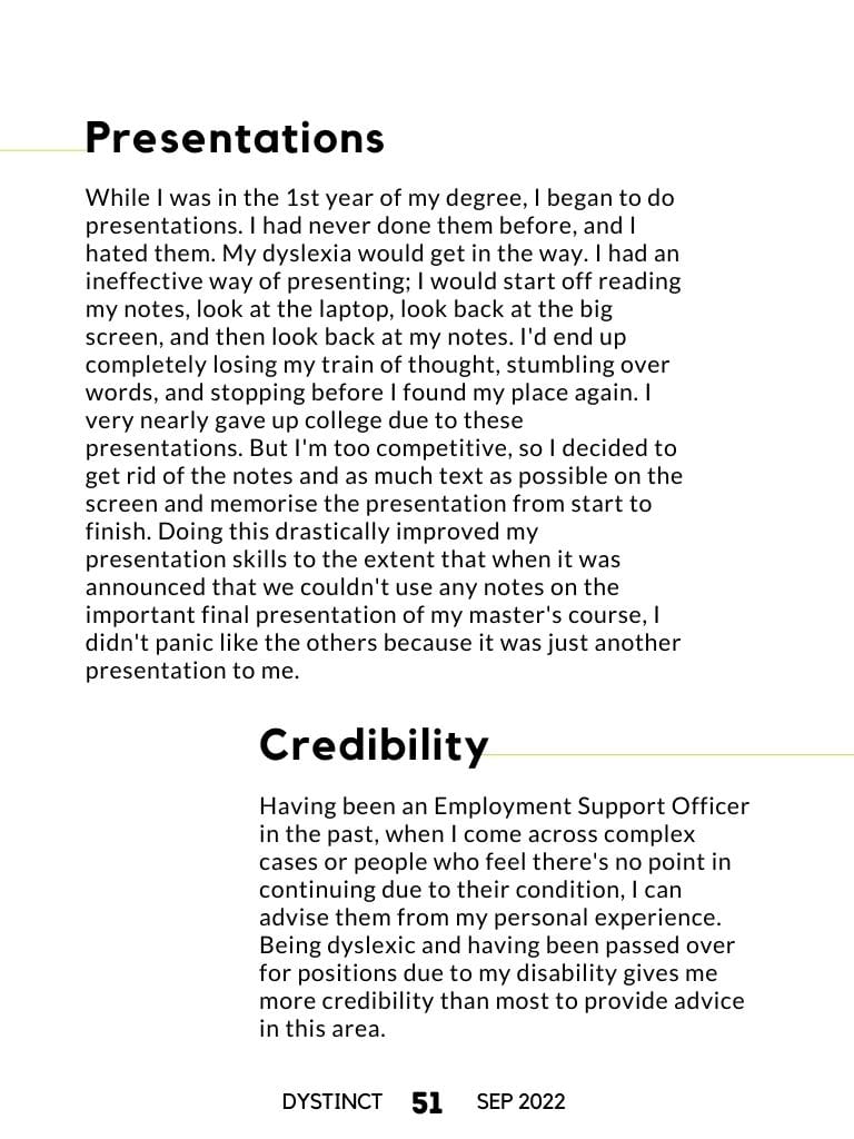 While I was in the 1st year of my degree, I began to do presentations. I had never done them before, and I hated them. My dyslexia would get in the way. I had an ineffective way of presenting; I would start off reading my notes, look at the laptop, look back at the big screen, and then look back at my notes. I'd end up completely losing my train of thought, stumbling over words, and stopping before I found my place again. I very nearly gave up college due to these presentations. But I'm too competitive, so I decided to get rid of the notes and as much text as possible on the screen and memorise the presentation from start to finish. Doing this drastically improved my presentation skills to the extent that when it was announced that we couldn't use any notes on the important final presentation of my master's course, I didn't panic like the others because it was just another presentation to me.