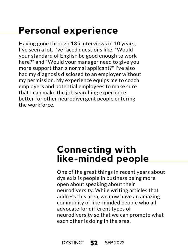 Having gone through 135 interviews in 10 years, I've seen a lot. I've faced questions like, "Would your standard of English be good enough to work here?" and "Would your manager need to give you more support than a normal applicant?" I've also had my diagnosis disclosed to an employer without my permission. My experience equips me to coach employers and potential employees to make sure that I can make the job searching experience better for other neurodivergent people entering the workforce.