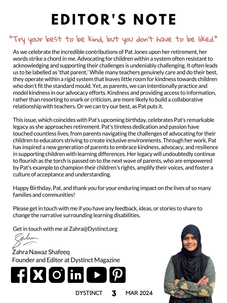This issue, which coincides with Pat's upcoming birthday, celebrates Pat's remarkable legacy as she approaches retirement. Pat's tireless dedication and passion have touched countless lives, from parents navigating the challenges of advocating for their children to educators striving to create inclusive environments. Through her work, Pat has inspired a new generation of parents to embrace kindness, advocacy, and resilience in supporting children with learning differences. Her legacy will undoubtedly continue to flourish as the torch is passed on to the next wave of parents, who are empowered by Pat's example to champion their children's rights, amplify their voices, and foster a culture of acceptance and understanding.