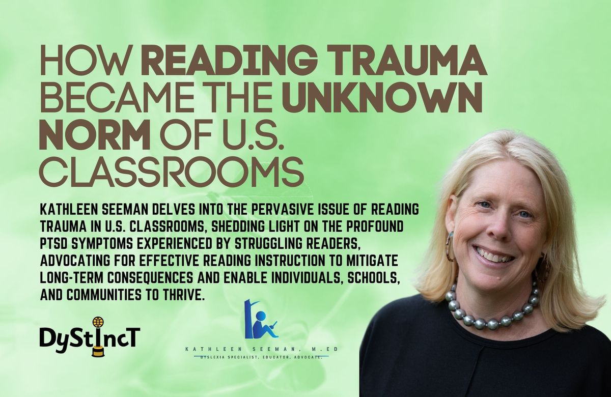 Kathleen Seeman delves into the pervasive issue of reading trauma in U.S. classrooms, shedding light on the profound PTSD symptoms experienced by struggling readers, advocating for effective reading instruction to mitigate long-term consequences and enable individuals, schools, and communities to thrive.