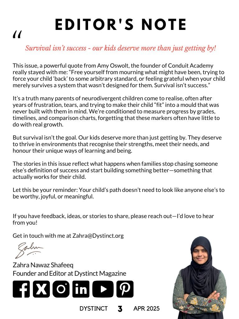 This issue, a powerful quote from Amy Oswolt, the founder of Conduit Academy really stayed with me: “Free yourself from mourning what might have been, trying to force your child ‘back’ to some arbitrary standard, or feeling grateful when your child merely survives a system that wasn’t designed for them. Survival isn’t success.”