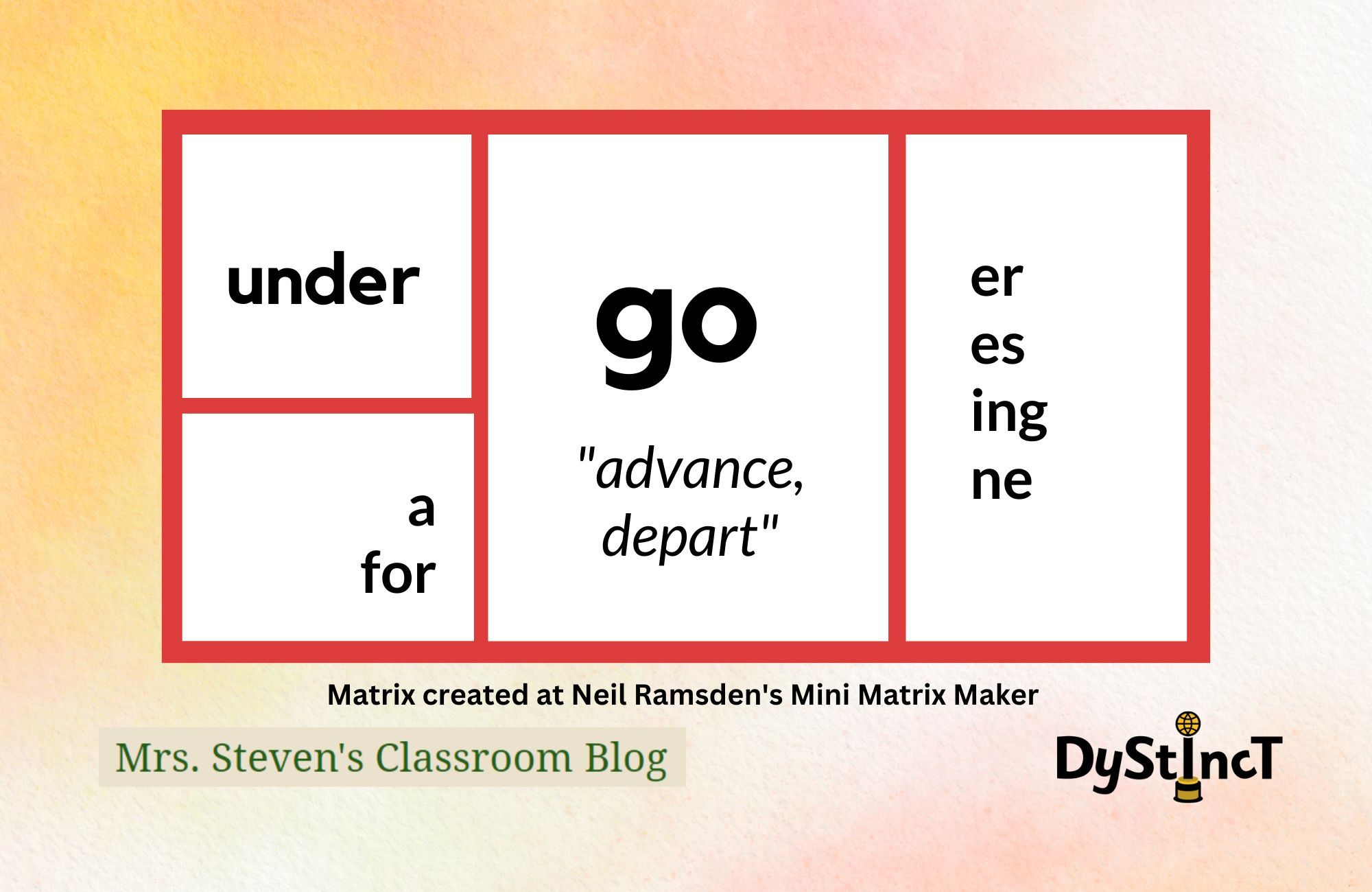 I suspected that the students understood that 'go' and 'goes' were related in meaning, but I wondered if they had ever actually seen 'go' surrounded by the other members of its word family. Had they seen that every member includes the base <go> or that we build those members by adding elements to <go>? If they had, they would not be thinking that *<ws> was a suffix to add to <go>, would they?