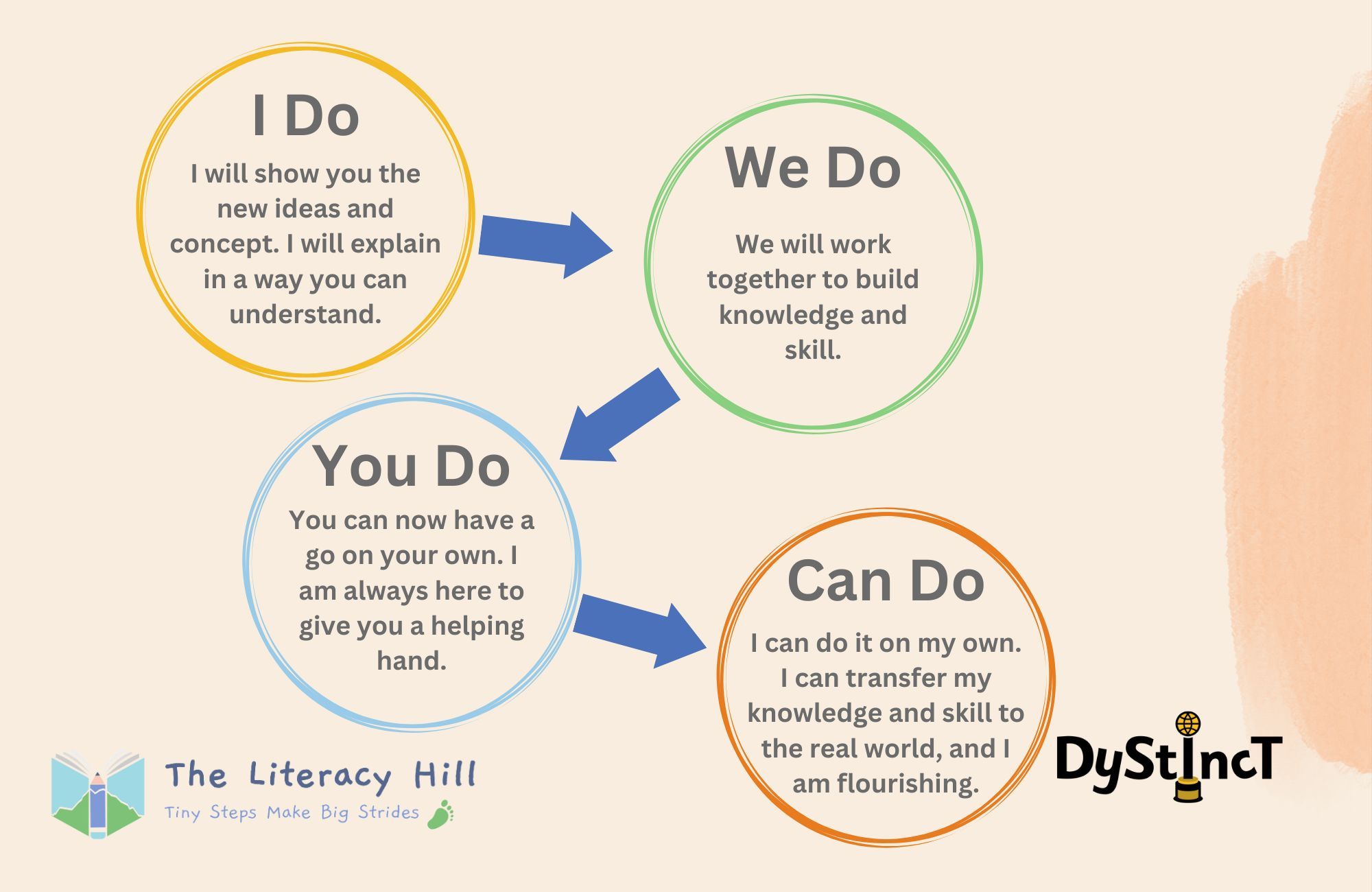 It is best to use the gradual release model —I do, We do, You do approach so that all children feel secure in their environment and within themselves. This method of delivery supports both the teacher and the student. Instruction has to be effective and show the way. It has been suggested that the gradual release model helps all students lift off and become 'can do' people—I have the skills and knowledge, and now I know how to connect the dots and transfer my knowledge and skills.