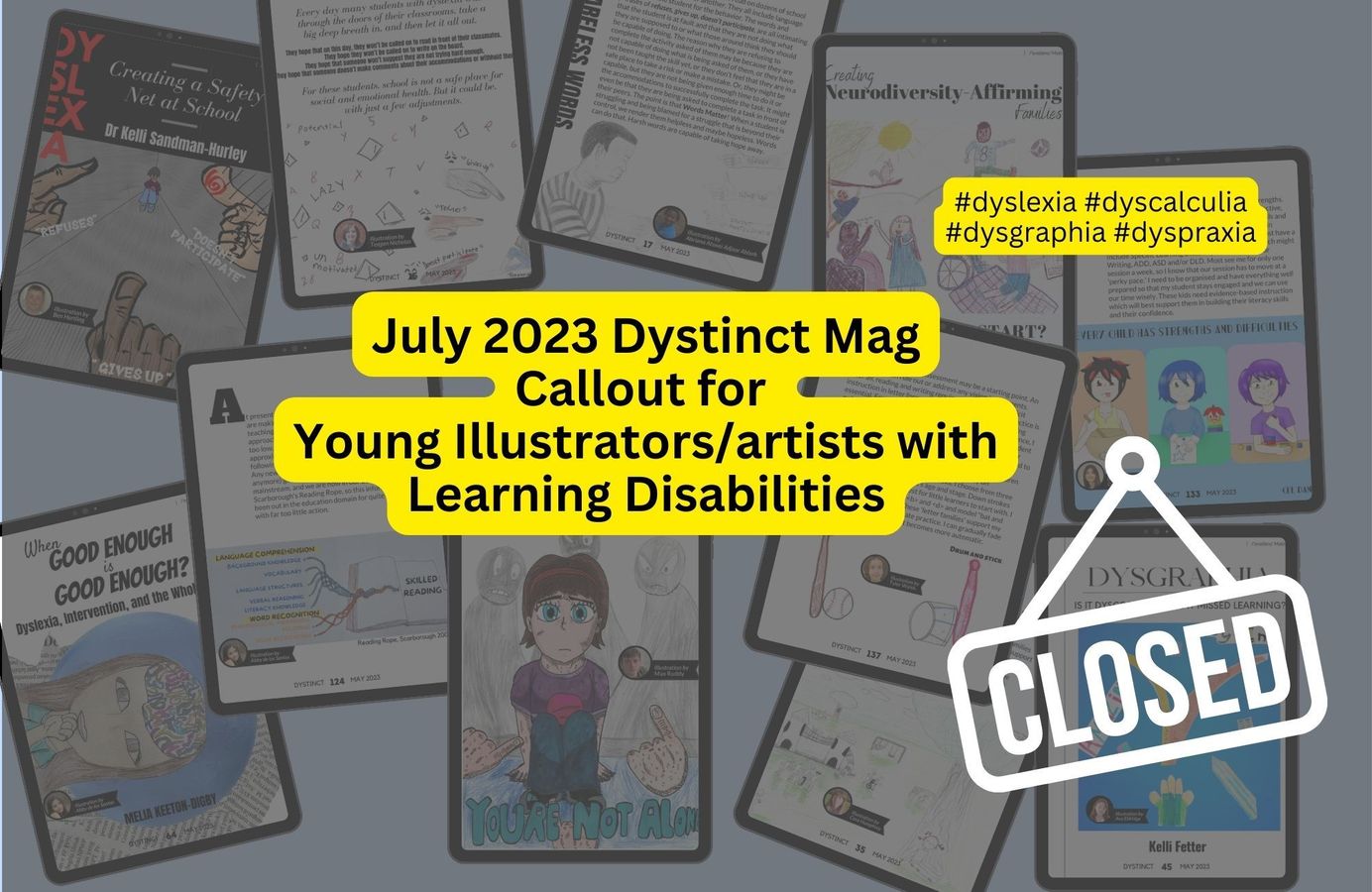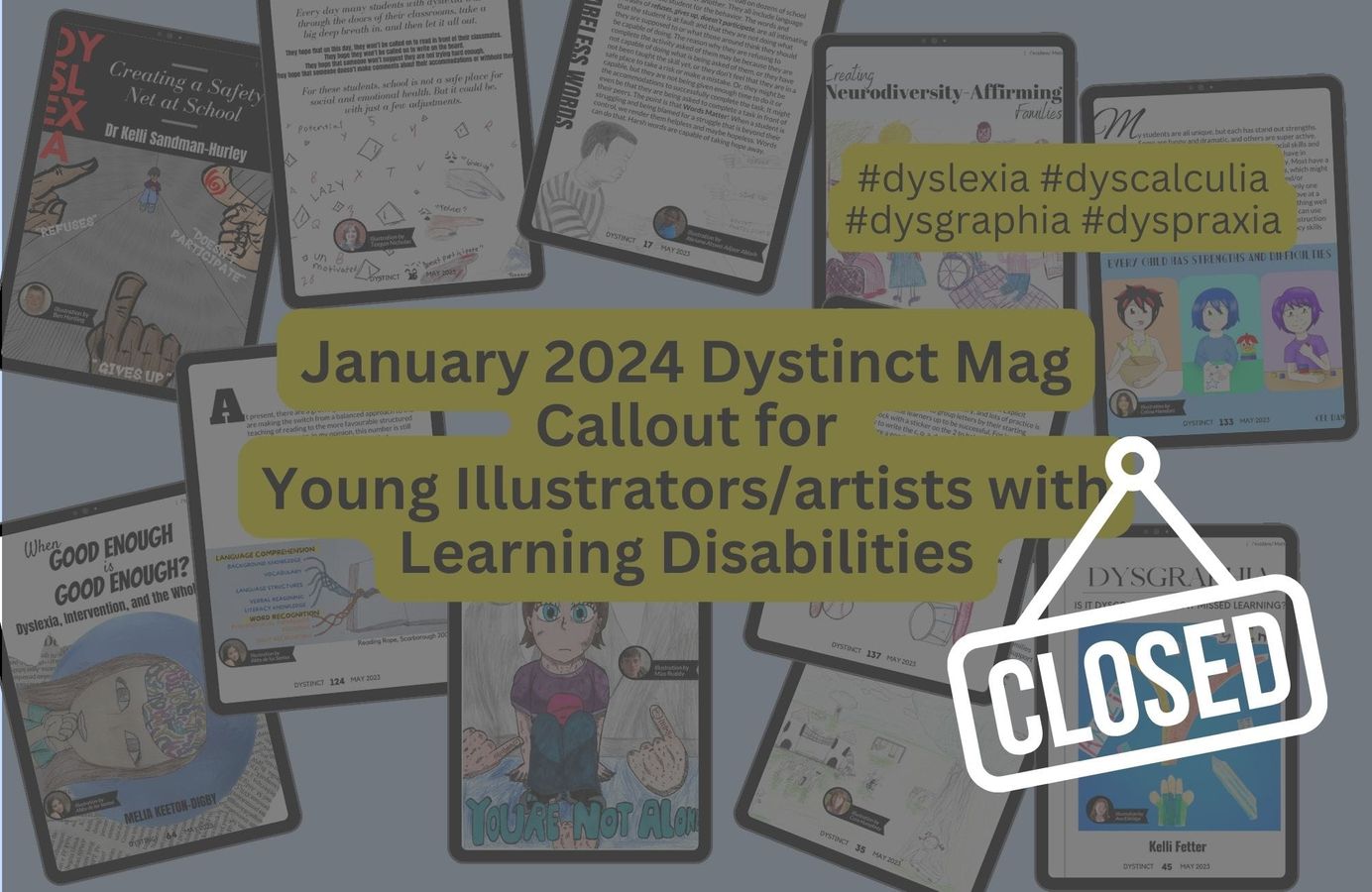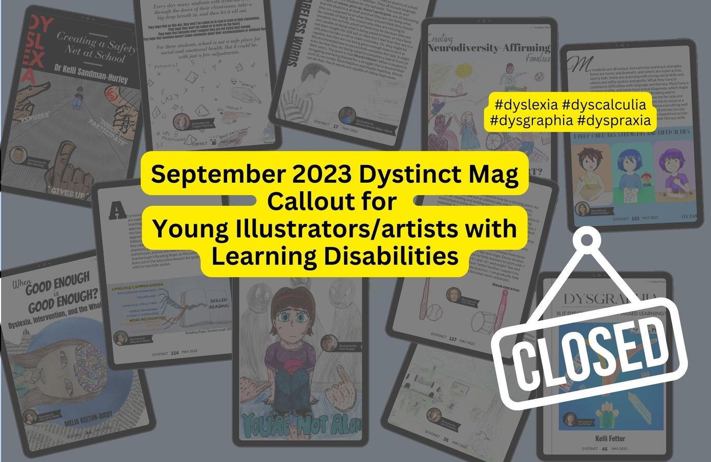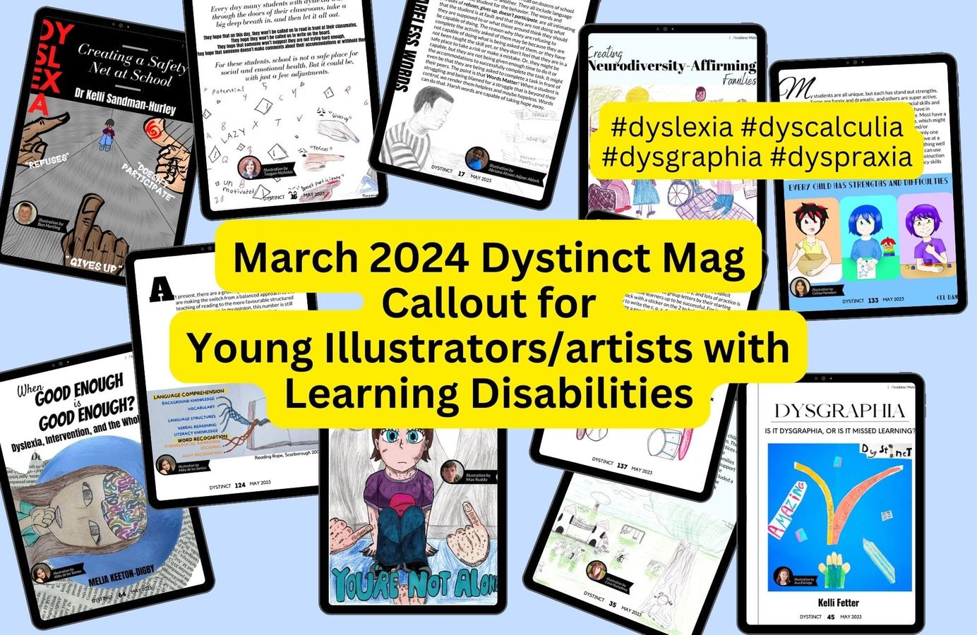 Dystinct Magazine provides a platform for children with learning disabilities (dyslexia, dyscalculia, dyspraxia, dysgraphia) to showcase their illustration talents. In every magazine issue, articles written by specialists are accompanied by illustrations created by children. Check out the list of open available opportunities now and submit your child's illustrations for a chance to be featured in the Dystinct Magazine.