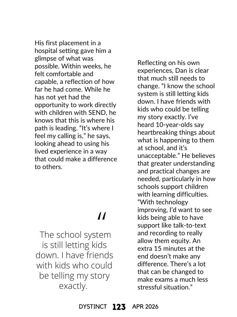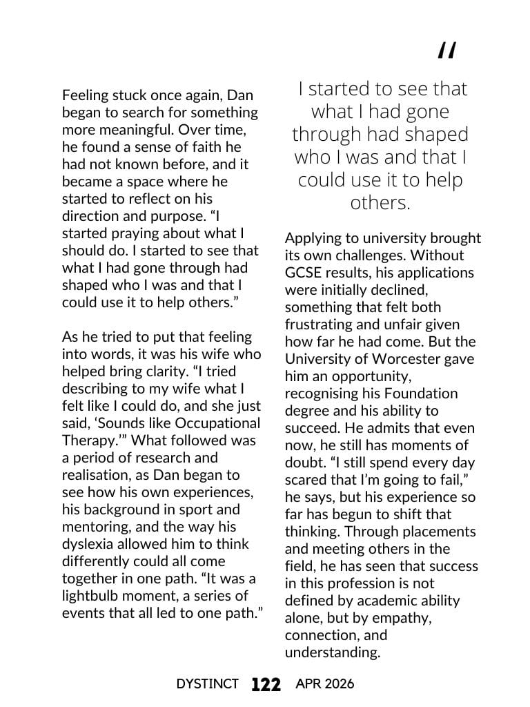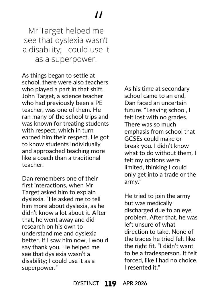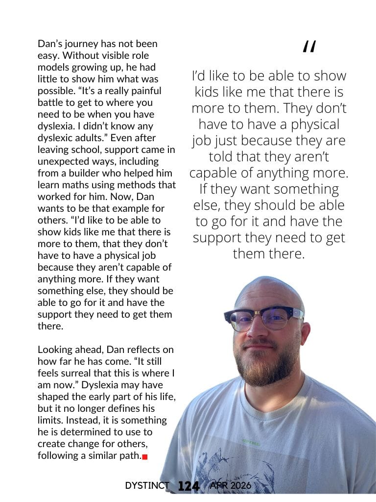 Looking ahead, Dan reflects on how far he has come. āIt still feels surreal that this is where I am now.ā Dyslexia may have shaped the early part of his life, but it no longer defines his limits. Instead, it is something he is determined to use to create change for others, following a similar path.