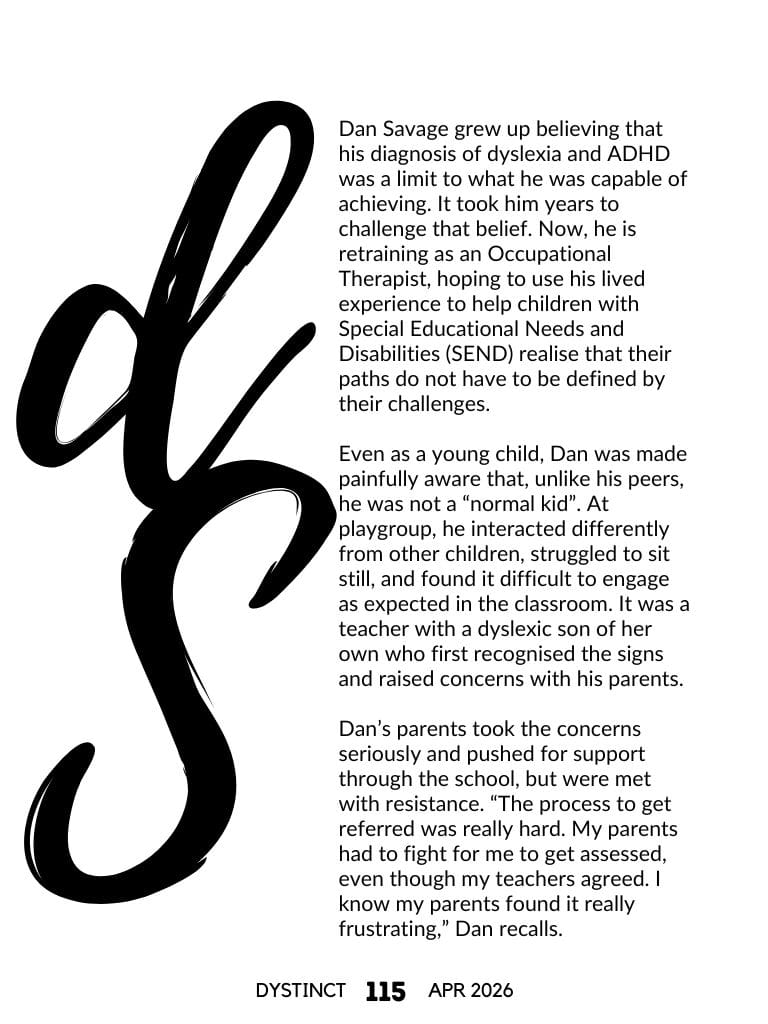 Dan Savage grew up believing that his diagnosis of dyslexia and ADHD was a limit to what he was capable of achieving. It took him years to challenge that belief. Now, he is retraining as an Occupational Therapist, hoping to use his lived experience to help children with Special Educational Needs and Disabilities (SEND) realise that their paths do not have to be defined by their challenges.