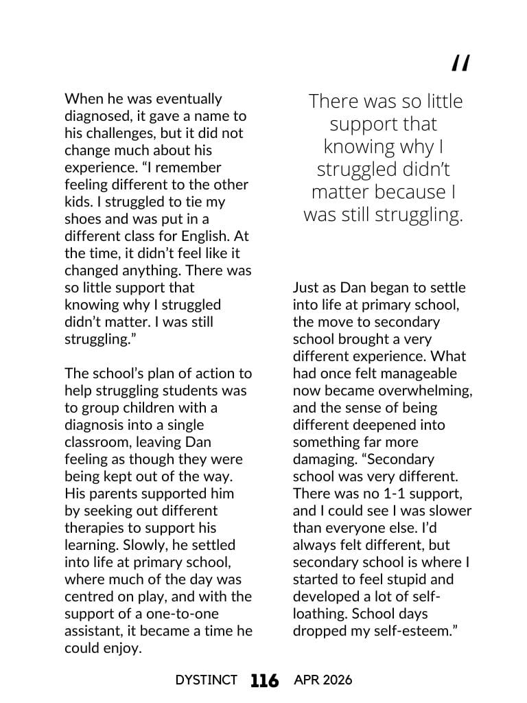 Even as a young child, Dan was made painfully aware that, unlike his peers, he was not a ānormal kidā. At playgroup, he interacted differently from other children, struggled to sit still, and found it difficult to engage as expected in the classroom. It was a teacher with a dyslexic son of her own who first recognised the signs and raised concerns with his parents.