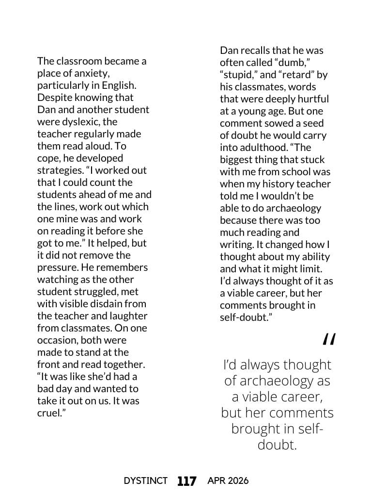 Dan recalls that he was often called ādumb,ā āstupid,ā and āretardā by his classmates, words that were deeply hurtful at a young age. But one comment sowed a seed of doubt he would carry into adulthood. āThe biggest thing that stuck with me from school was when my history teacher told me I wouldnāt be able to do archaeology because there was too much reading and writing. It changed how I thought about my ability and what it might limit. Iād always thought of it as a viable career, but her comments brought in self-doubt.ā