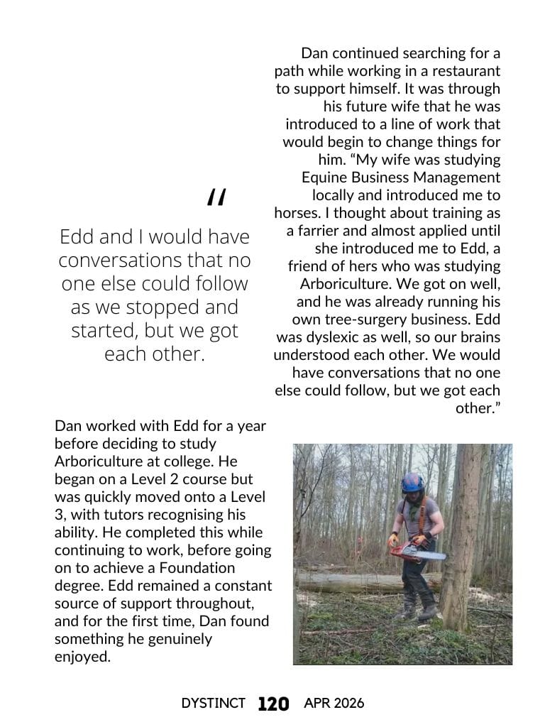 Dan continued searching for a path while working in a restaurant to support himself. It was through his future wife that he was introduced to a line of work that would begin to change things for him. āMy wife was studying Equine Business Management locally and introduced me to horses. I thought about training as a farrier and almost applied until she introduced me to Edd, a friend of hers who was studying Arboriculture. We got on well, and he was already running his own tree-surgery business. Edd was dyslexic as well, so our brains understood each other. We would have conversations that no one else could follow, but we got each other.ā