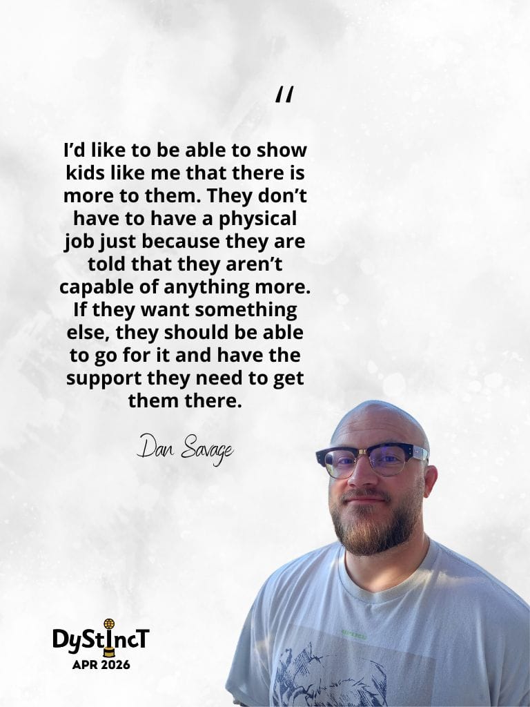 Danās journey has not been easy. Without visible role models growing up, he had little to show him what was possible. āItās a really painful battle to get to where you need to be when you have dyslexia. I didnāt know any dyslexic adults.ā Even after leaving school, support came in unexpected ways, including from a builder who helped him learn maths using methods that worked for him. Now, Dan wants to be that example for others. āIād like to be able to show kids like me that there is more to them, that they donāt have to have a physical job because they arenāt capable of anything more. If they want something else, they should be able to go for it and have the support they need to get them there.