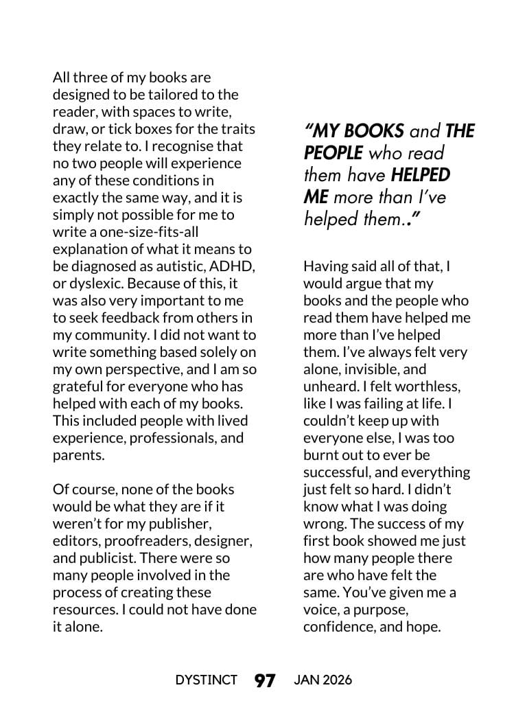 All three of my books are designed to be tailored to the reader, with spaces to write, draw, or tick boxes for the traits they relate to. I recognise that no two people will experience any of these conditions in exactly the same way, and it is simply not possible for me to write a one-size-fits-all explanation of what it means to be diagnosed as autistic, ADHD, or dyslexic. Because of this, it was also very important to me to seek feedback from others in my community. I did not want to write something based solely on my own perspective, and I am so grateful for everyone who has helped with each of my books. This included people with lived experience, professionals, and parents.