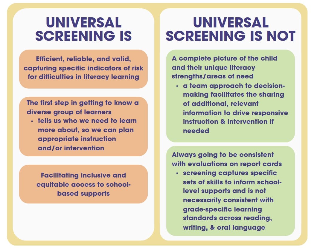 Universal screening has a fundamental role in multi-tiered systems of support, reducing bias and increasing equitable access to support for learners who are at risk for or currently experiencing literacy difficulties. While the value of a systematic approach to literacy assessment (including universal screening as a first step) has been well established in research for some time, every jurisdiction varies in its approach and timeline to implement this inclusive process.