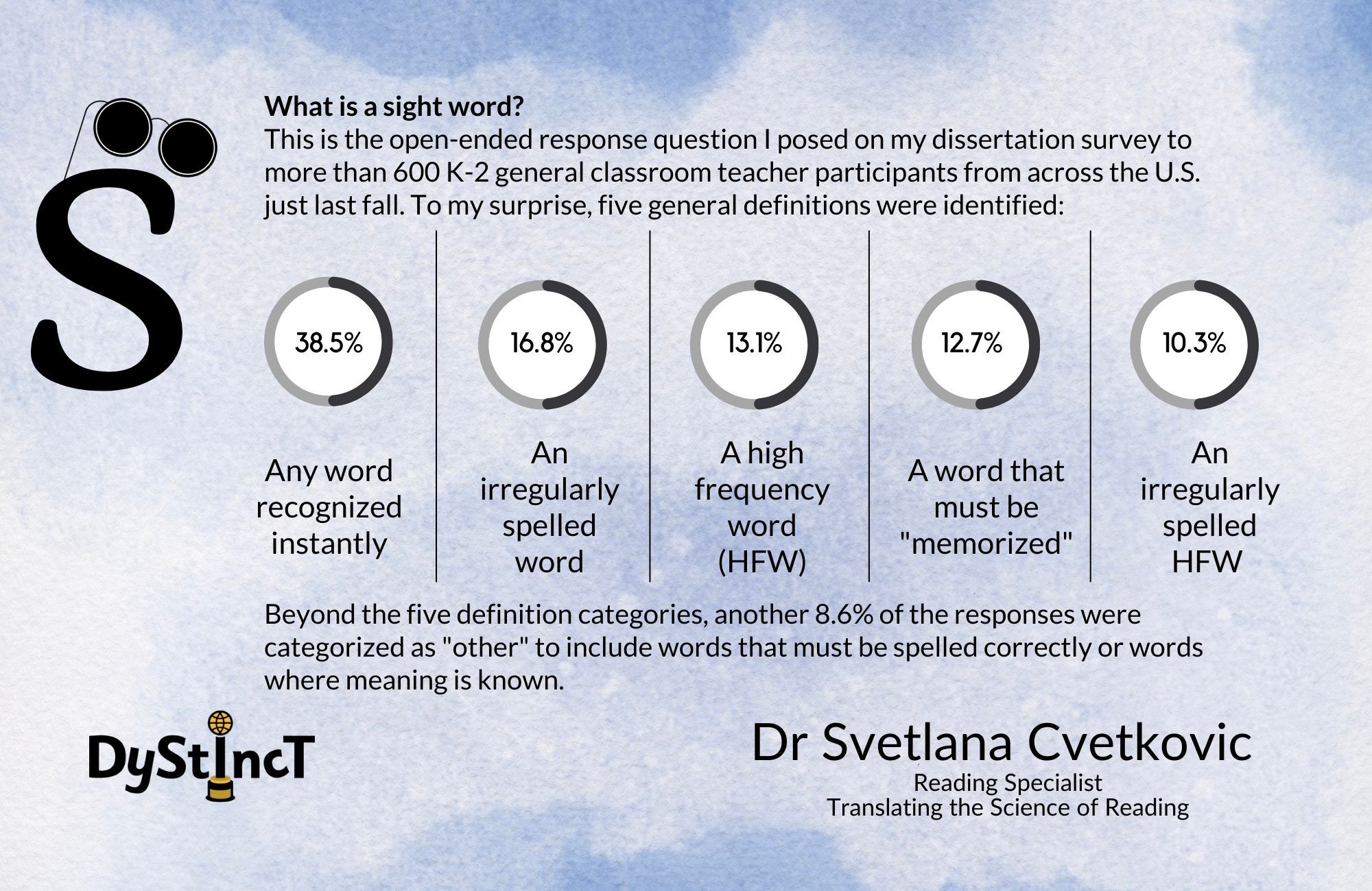 The follow-up open-ended response question (what is the one essential daily routine you believe accelerates sight word development for students?) resulted in still greater varied responses with 45 different identified categories. All this to say, as educators, it appears we have a confused and potentially problematic understanding of how sight word development is understood, defined, and taught.